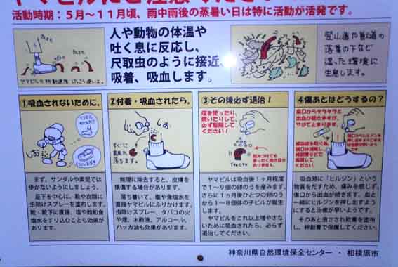![]() ヒルの退治方法を書いた看板を見つけました。最近の丹沢はヒルが多いので塩と 虫よけスプレーを持って行くといいです。 、 |