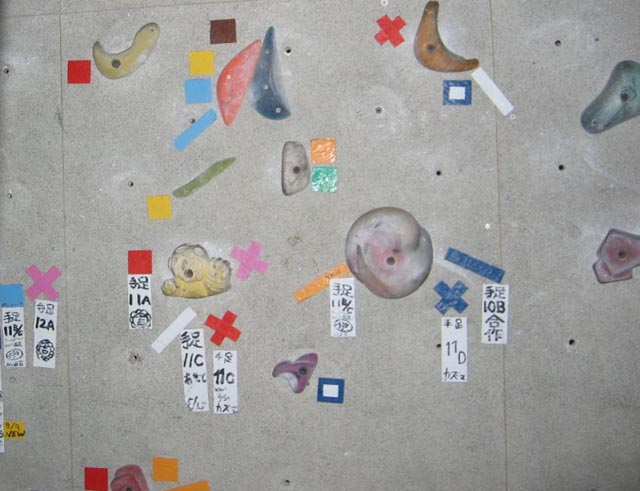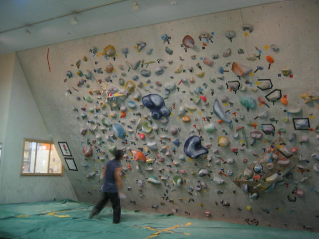 ![]() 施工はホッチアンドホールド社でスメアリングの効く吹きつけタイル&ザラザラ仕上げのボード にホールドが取り付けてあって高級感がある。高さ22メートルに作られるルートだから一つ一 つのムーブは難しくない。日和田の松の木ハングが登れる程度の人がイレブンに挑戦できる (持久力があればオンサイトが可能)。 、 |