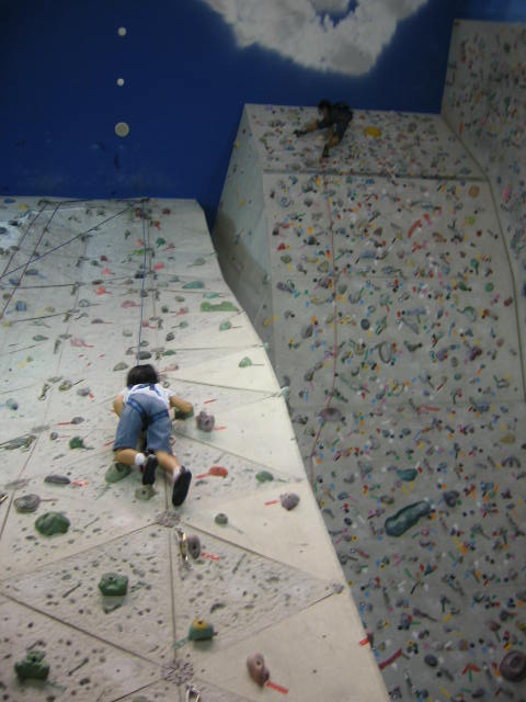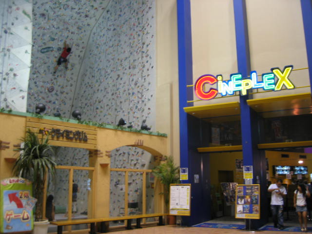 右が映画館の入り口で、左がクライミングジムである。ちなみにジムの左はボーリング場になっ ている。ジムの壁の高さは22メートル、たぶん関東では最大の高さだろう。ジムのオーナーは ショッピングモール全体の経営会社だ。 、 |