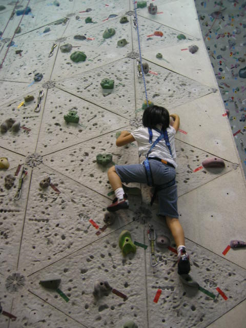 一番目立つ正面の壁は正三角形のオブジェボードによって作られた多面体仕様だ。 レンタルハーネスやシューズはキッズ用が充実している。チイちゃんが登り始める。 、 |
