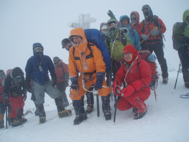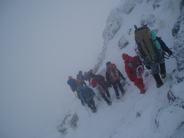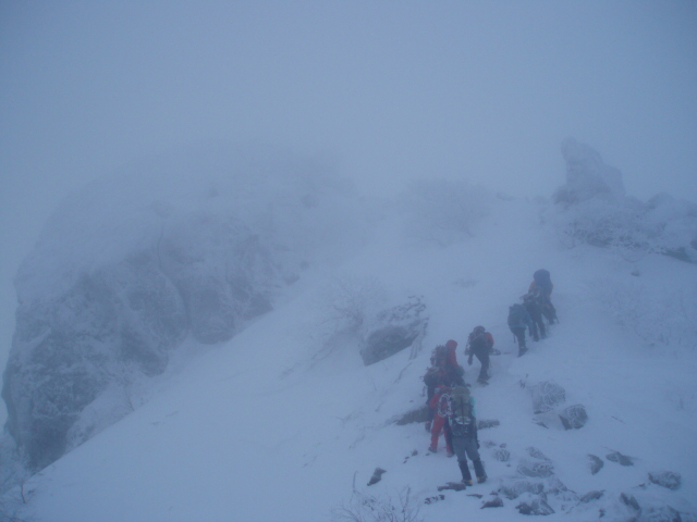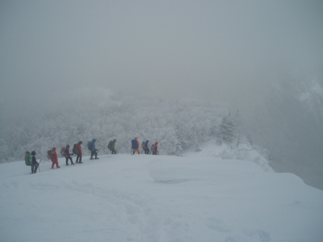 同人のT氏が先頭を歩き、雪山初めてのAさん、Aさんをショートロープで確保する Tk講師、雪山初めてのBさん、Bさんを確保するMa講師、そして雪山二年生諸君 と続きしんがりはスタッフ会員のH氏となって隊列を組み慎重に下った。ピッケルを 持つ手が吹雪に冷やされて冷たかった。 、 |